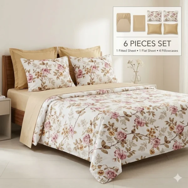 نوفر لكم أغطية سرير فاخرة مكوّنة من 6 قطع كاملة، مصنوعة من قطن 100٪ طبيعي بجودة عالية 🌿