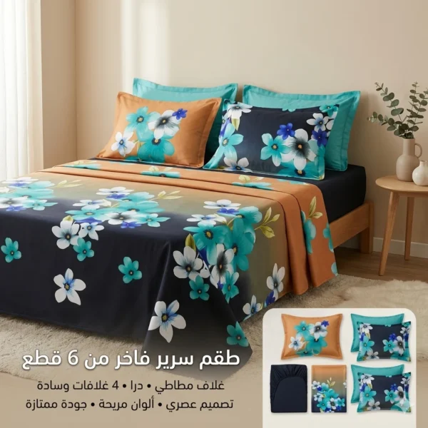 نوفر لكم أغطية سرير فاخرة مكوّنة من 6 قطع كاملة، مصنوعة من قطن 100٪ طبيعي بجودة عالية 🌿